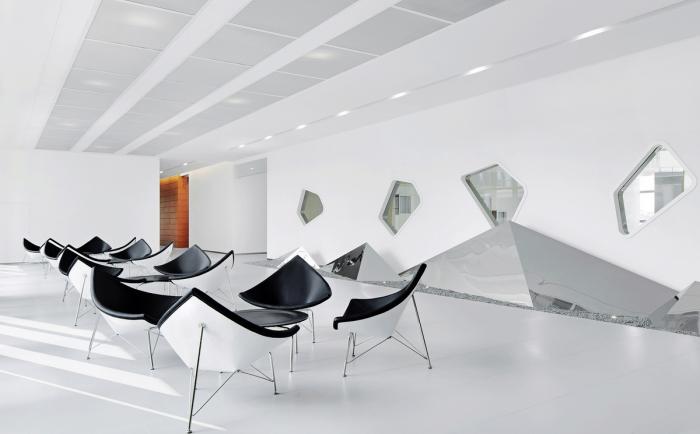 填单区的奶酪墙实际上是视觉去结构化的最小化消隐结果,使用单位要求将N字形的钢结构用封闭墙体形式包裹,设计师则希望用尽可能小的封闭面的透漏关系回应策略。思考应该都是基于不同时间节点的意识反映,如果这个“剧本”是今天写,在设计形式上思考语言应该会有所不同。
