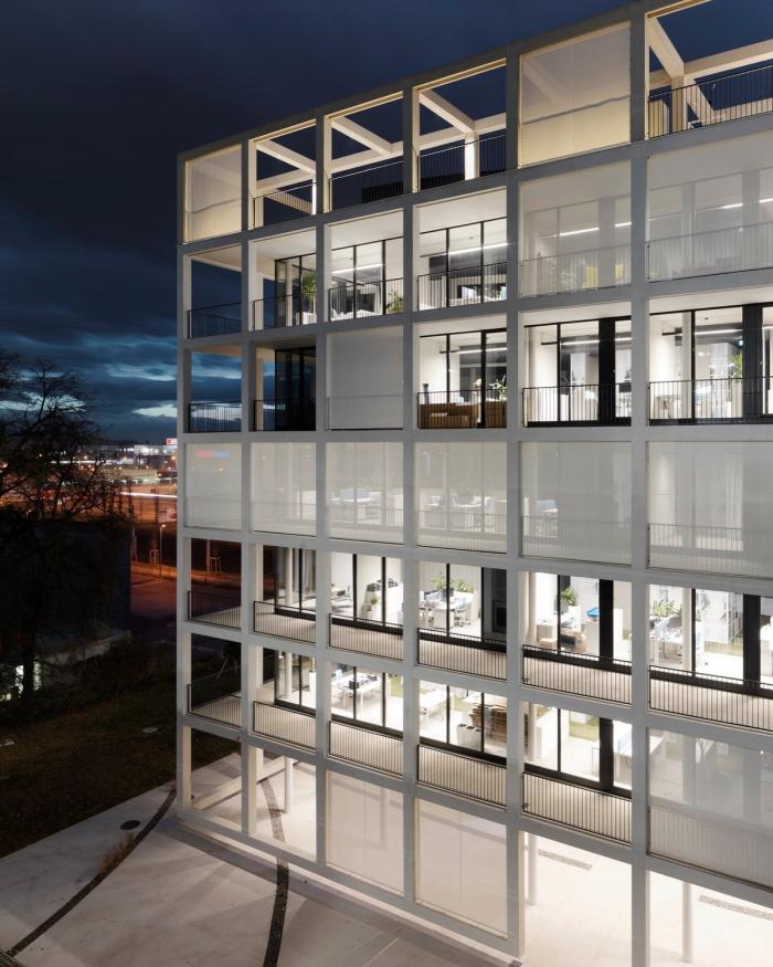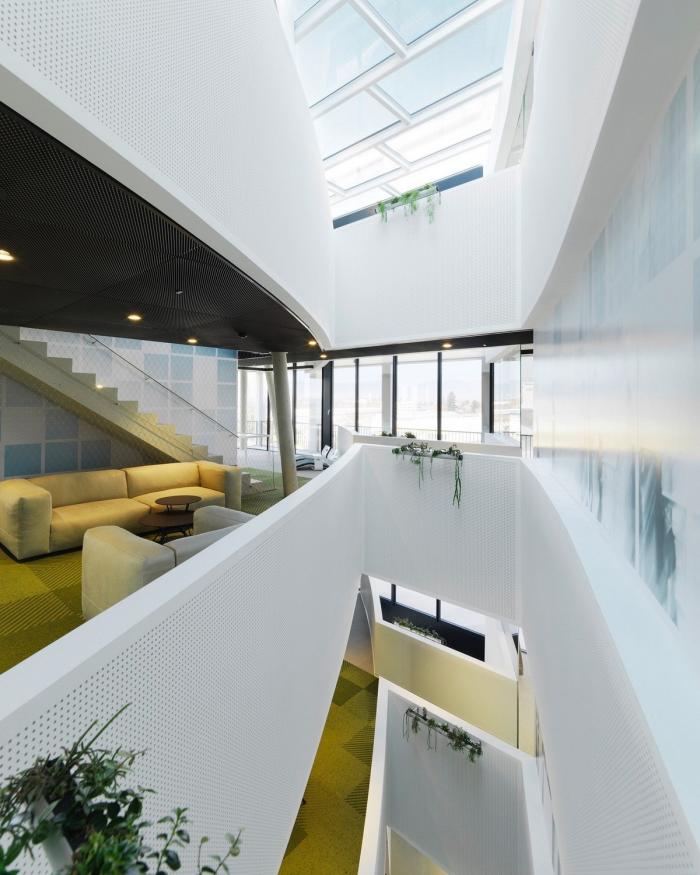 建筑是一个立方体,整个七层楼被一个弯曲的中庭隔开,由浮动混凝土结构和玻璃核心筒组成。白色混凝土外网格集成了一个自动遮阳系统,可以根据人们的使用和日照情况动态改变建筑的外观。