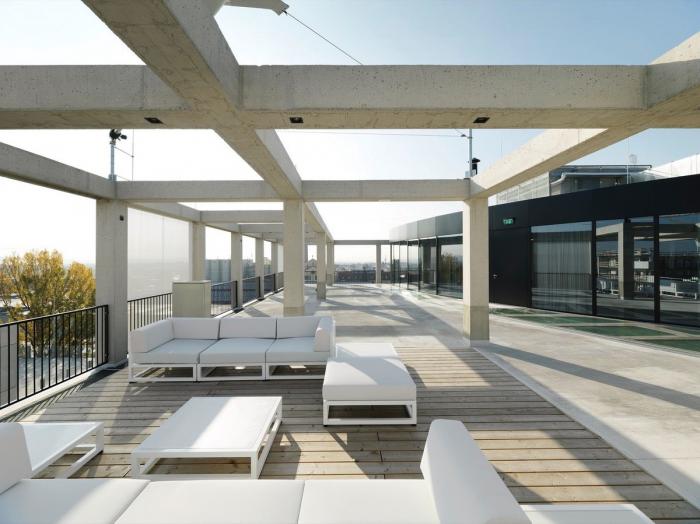 第三层是一个透明层,可以使自然光进入围绕一个细长的中庭形成的分散的办公空间。这个多层系统为用户提供了不同的结构和功能元素,并解决建筑本身的节能问题。