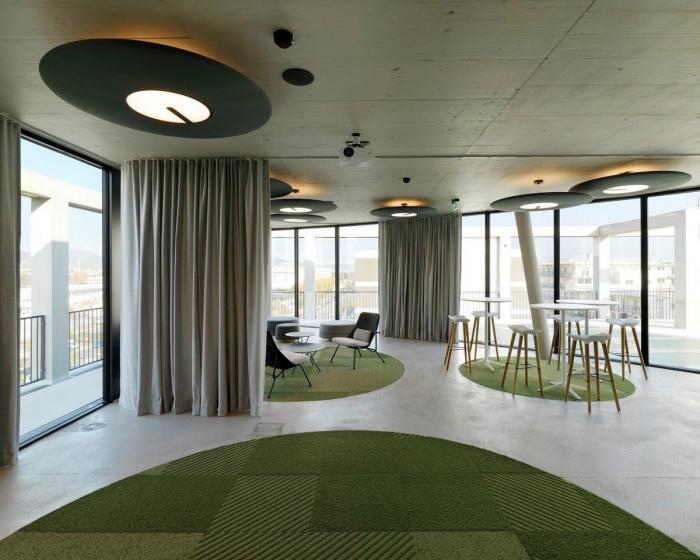 建筑核心筒包括楼梯和电梯以及所有的建筑设备,并通过网状的吊顶将这些设备向外分配到办公空间。这个新的天花板系统,满足空间、美学和声学的需求,是为建筑开发和定制的。为了通过协调工作的物理、虚拟和社会世界,创造一个鼓舞人心的健康的工作场所,在室内和外部概念中实现了亲生物的方面,包括植物、屋顶露台、阳台和建筑前院。
