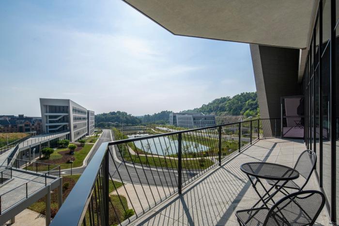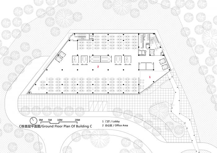 项目坐落在广州天河软件园一个尽端相对独立的丘陵用地,马蹄形山丘围绕着场地,背山面湖、环境优美;地形高差明显,建设用地窄长而不规则。根据城市设计要求,建筑高度需控制在20米内,以实现与周边山体的和谐。有趣的是,设计团队曾在多年前参与该区域城市设计并确定了这一限高,这在今天成为了富有挑战性的约束条件。