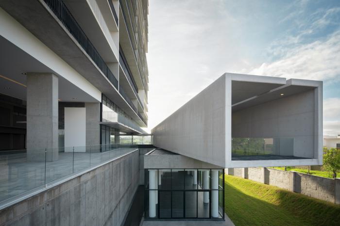 建筑师将部分的休闲娱乐空间置于一层,以和外部的绿地环境产生联系。建筑师将不同体块在多个维度组合成一体,使得来访者进入大楼所看到的第一个场景,是简洁并基础的几何元素。同时,建筑师还用一个白色混凝土体块容纳了水体,将户外水池所反射的自然光照引入室内,从而和室内环境产生微妙的关联。