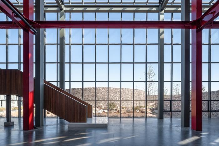 整个酒庄的设计大开大合,有西北的苍茫、雄浑与倔强,也有人文主义的柔软、轻缓与细腻。总体来看,以效率为先的生产区,空间形态上更为冷静、强硬,体现为一种现代性的力量;而以参观休闲为主的其他功能区域,则稍显柔软与从容,体现为一种对自然对万物的感召。