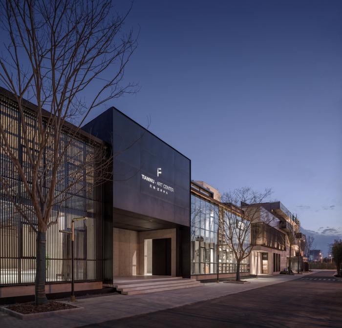 集书店与秀场于一体的天物艺术中心,像一个巨大的会呼吸玻璃盒子,矗立在主楼旁边,排列组合的金属架构杆丰富了幕墙立面,一虚一实,交相辉映。顶部空间整理并保留了原有的钢制桁架,粗犷冷冽,植入原木天棚,提升了温度感。新增的天窗将自然光线引入室内,让建筑得到呼吸,赋予空间新的活力,与简洁流畅的清水混凝土地面形成反差。