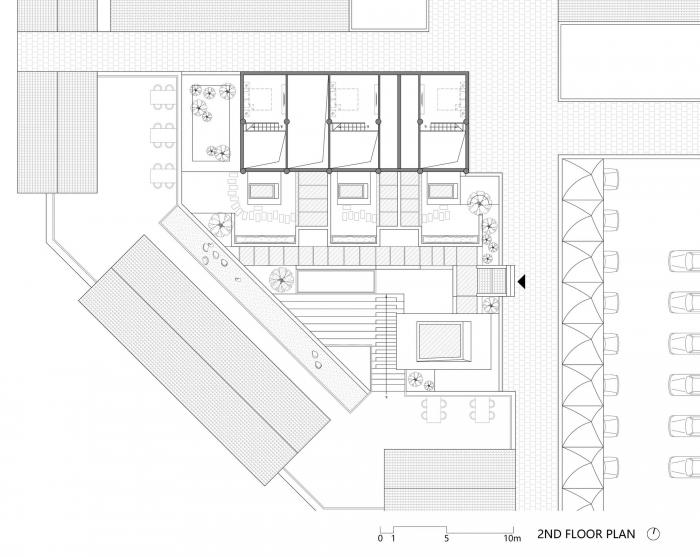置身苑中,为玉皇阁之凌势所撼,颇有觉悟;漫步老街,见乡风淳朴,甚为感动。农夫妇孺,嬉戏往来,烧饼豆腐,香飘深巷,何以闹市中作雅居,喧嚣中设雅园,实为一题。于是将院中分,南北为动静两区,筑高墙为隔,划分三间小院,各置一轩,轩者,有窗之小屋,故顶开斜天窗,侧开大窗,以望阁,阁旺则院兴,故所有景面阁而向。