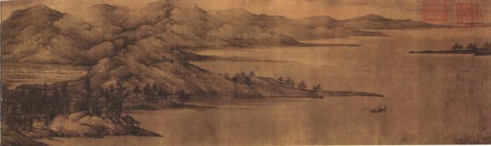 建筑场地为湖岸缓坡,茂林掩映、隔水与园区焦点建筑中国国家馆毗邻。站在中国馆二层露台北望,远山近湖,层林叠嶂,游人隐现于湖岸岛屿之间,颇似一幅动态的中国古典山水画卷。为传达中国传统空间设计理念,我们追寻画坛巨匠董源画作中水岸山林,亭舟隐现的山水人居图景,敲定了“行望居游”的画意式设计策略。