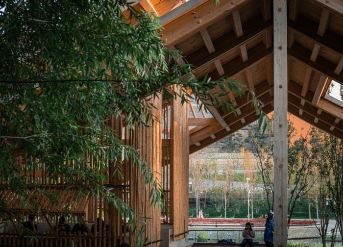 滨水建筑的材料选取木、竹等自然材料做为主材,分别构成木架、竹墙与木瓦屋面三种建筑要素。建筑结构采用重木结构体系,利用现代胶合木塑形能力,解决了屋面反曲形态。梁、柱拼接均采用工厂加工,现场安装的装配式作业方式,以应对展会颇为紧张的工期。竹墙从水泥台基四面挑出,如竹帘般包裹空间,同时借助大屋顶之下的暗与室外环境的亮形成反差,让林景湖景由竹墙透射而入,与竹墙相互叠映。屋面选用木望板配防水层挂木瓦的现代做法,较之传统木望板砂浆铺青瓦的做法减轻了屋面的配重,达成木结构的节材节用。建筑用材因势利导,随形制器,寥寥几笔勾勒出滨水建筑简约闲逸之态。