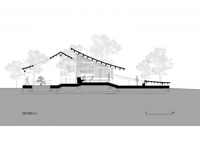 我们的设计截取中国传统山水画中屋舍的双坡屋面,在场地内勾画出一道似是而非的屋顶,将其覆盖于场地之上,状如水边一处山坡,形成陂池相映的格局。山墙面完全打开,将屋宇下的行旅流线完整揭示,穿越树林、庭院、竹堂、月台四组空间。从湖对岸看去,游人好似由屋中进入,山中穿出,直抵水边,完成行、望、居、游的感官体验。建筑似山非山,似屋非屋,与自然促膝交谈,又各得其所。房屋朝向选择一坡朝向主路,保持正常的檐口高度,另一坡朝向湖面,屋面直接向水面延展,几乎逼近地面。檐口的高低之态,远就永宁阁,近接妫汭湖,呼应成趣。