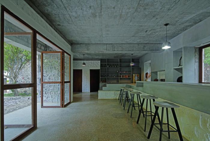 餐厅使用的混凝土十字柱是当地石砌十字柱的改良,较大的支撑跨度为室内使用创造了灵活性,同时解放了建筑立面,使其如同一个漂浮在水上的亭榭。