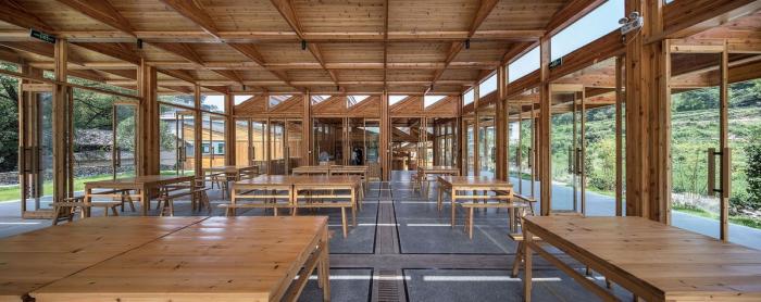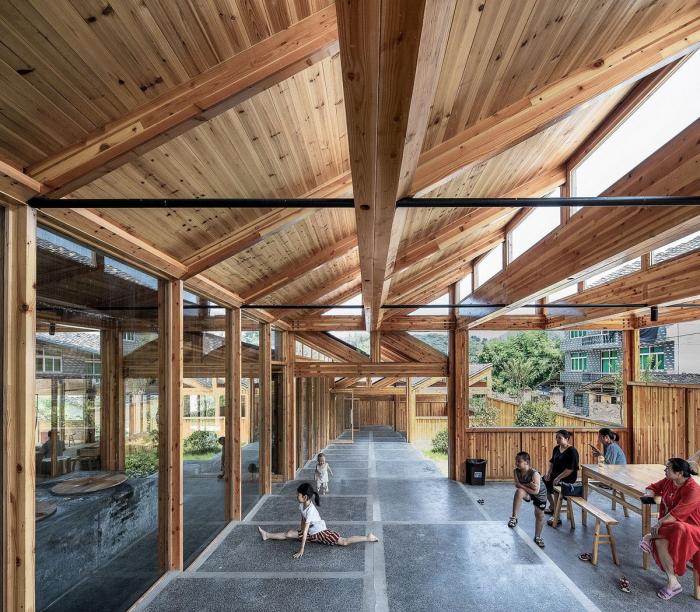 建筑的一侧设有供游客参观的通廊,游客可以顺着楼梯按顺序观看到豆腐制作的整个过程,最后到达最顶端的品尝区。这里不仅可以尝到新鲜出炉的豆腐,也能欣赏到溪水对岸历史村落的美丽景致。工坊整体采用木装配结构,在实现现代工坊生产目的的同时,也与村庄内传统的榫卯结构房屋相呼应。