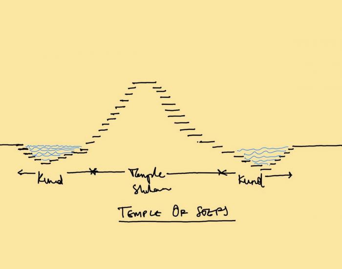 寺庙本身的规划来源于印度南部 Tirupathi 一座10世纪庙宇,它们供奉同一位神祗。相似的例子有, Balaji 与 Varahaswamy 的寺庙和圣池(Pushkarini,一种水箱)。建造过程使用当地易得的黑色石灰石板,将其堆叠形成寺庙主体。相同的堆叠轮廓同样运用于下半部分,将土壤与植物种植在此,以缓冲热量。最后,石块堆叠形成了石梯,即通向水面的台阶。