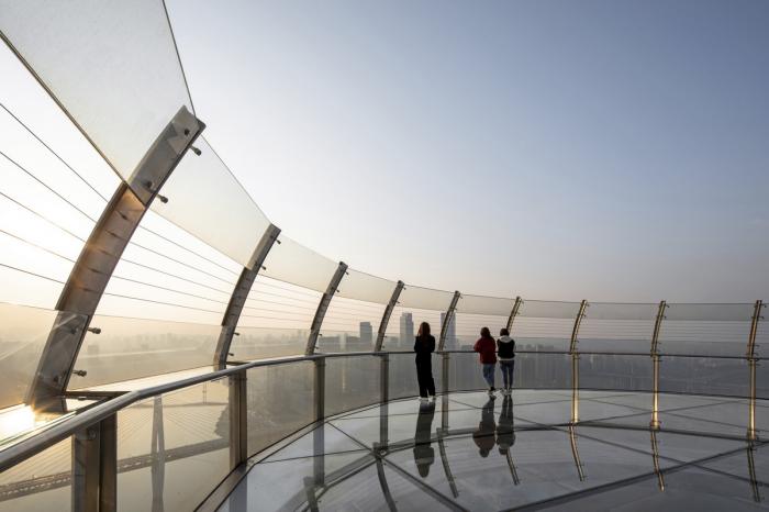 长廊长300米,跨越四座塔楼,同时通过连接桥梁与两座更高的塔楼相连接。这座水平摩天大楼拥有15000平方米的设施,其中包括花园、种类繁多的餐饮空间、酒吧和活动空间、住宅会所、无边泳池和酒店大堂。长廊上还设有一座公共天文台,游客们站在露天观景台的玻璃底板之上,可以欣赏长江和嘉陵江交汇处的景色。萨迪夫建筑事务所延续了新加坡滨海湾金沙酒店的“空中公园”,通过水晶空中走廊继续探索连接建筑的潜力,为密集的城市发展提供充足的空中公共空间。
