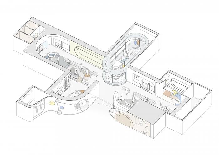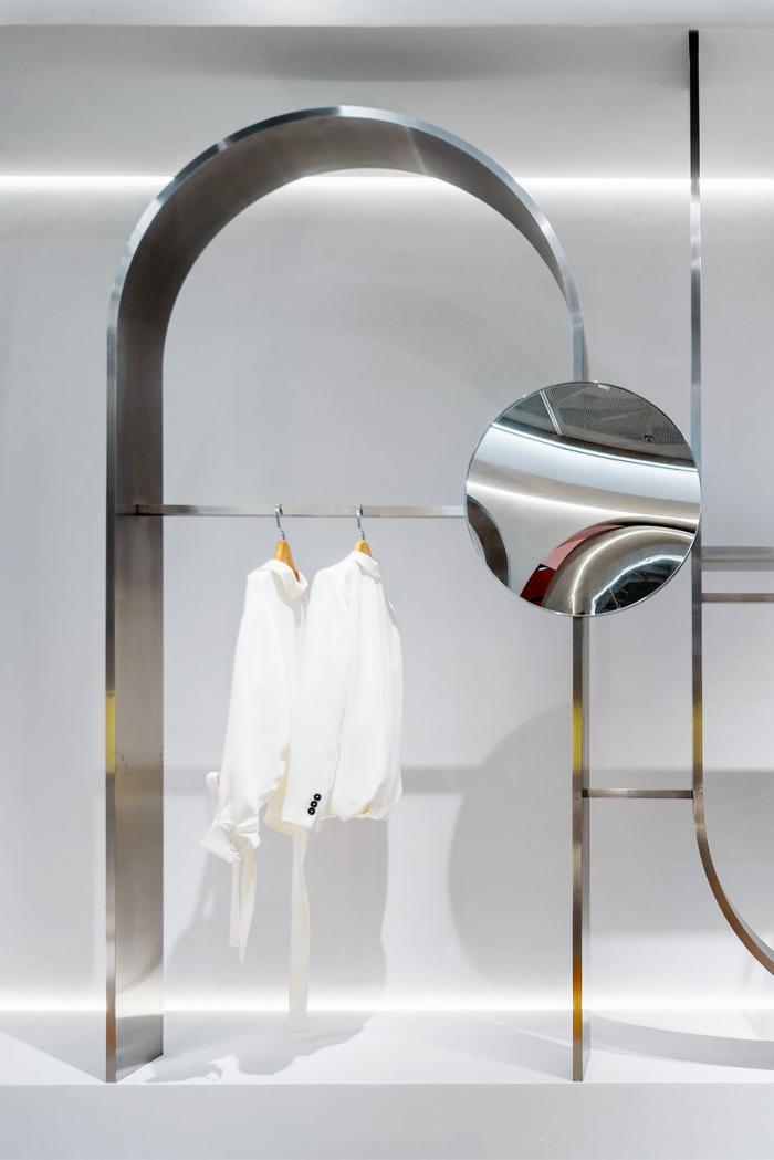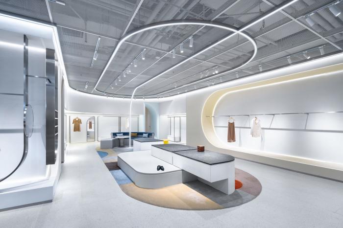 高矮不一的半弧形墙壁,与衣服的裁剪融为一体,仿佛是“量体裁衣”定制一般。墙壁上的弧线与屋顶弧形天花延伸至地面的弧线互相交织,营造出曲线美的同时也自动分流了顾客的购物路线。空间顶部线条纵横交错的天花内嵌了灯管,与室内的照明形成交错的光线分布,与镜子层叠映射出层次感。墙面整体柔和的颜色与不同区块活跃明快的彩色几何拼接地毯与墙面的色调互相均衡,完美的进行了活力与质感之间的衔接过渡。精选的定制水磨石,天然大理石等材料,保留着原始的打磨痕迹,与衣物的手工剪裁纹理相碰撞,仿佛让人置身于抽象派和构成主义的美术馆之中。