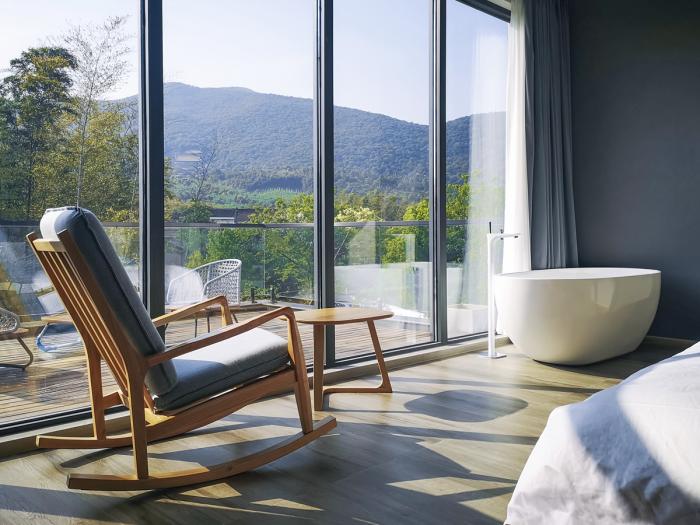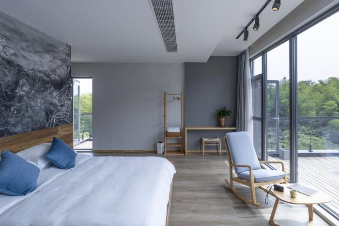 如果说实墙体的设置是为了划分空间功能、创造私密性的必要,那么在本项目中,窗、阳台、玻璃隔扇等具有连接建筑与景观场景功能的构件就成为了让室内与室外、人与自然、建筑与自然互联互通的重要手段。在二、三层的客房,设计师根据每间客房所处方位与周边自然条件,采用了朝向不同景观的大面积转角落地窗。同时,每间客房的主题与其观赏到的不同景观(溪涧、远山、茂密的竹林等)呼应,形成了不同的室内风格,这些落地窗如同摄影中的取景框,将不同的自然景观如同画卷一般完整地在住客眼前展开,建筑内部实现了对自然景色最大化的吸纳,“探溪”“沐阳”“摇竹”等别致的房间名也由此得来。在松楼里,每一处开窗都是作为摄影师的业主与设计师精心观察后的取景编排。