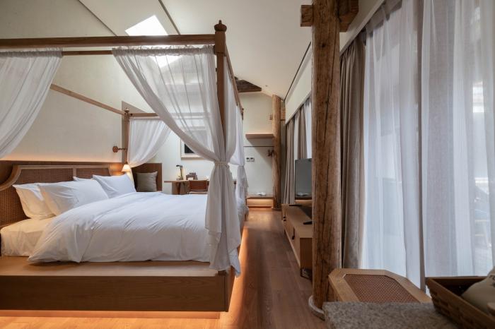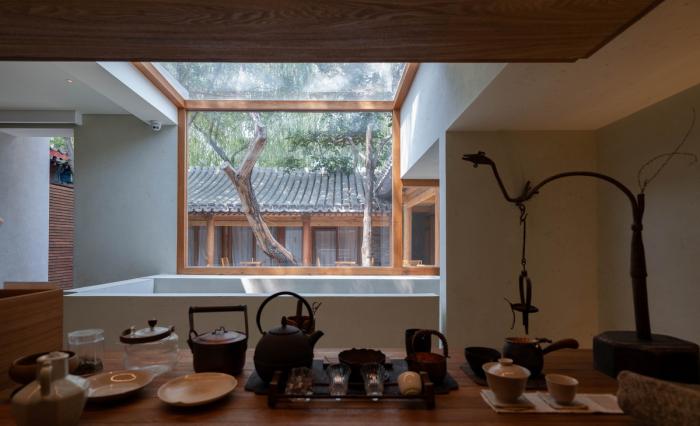 院子平面成一个U字型,与隔壁墙体形成四面围合。在这里我们需要满足四间客房,一个下午茶和早餐厅的功能,虽然功能并不复杂,但是面积的捉襟见肘让我们大伤脑筋。入口处需要一个小服务台,接下来就是,四间客房,倒座房是其中的一间,面积最大,它的格局介于套房和普通客房之间。由于房间的内部标高还不错,我们考虑了榻榻米方案,床垫直接落地,来增加酒店的放松休闲感。其他三间客房在左手边一字排开,面向院内借景。改造之后的落地窗会增加更多的自然采光,另外屋顶也设计了采光天窗,即使是躺在床上也能感受到自然光线的洗礼。