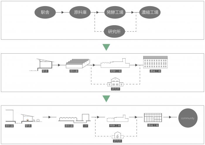 场地的4栋建筑尺度不一,破损程度不同,呈现出多样有趣的空间多样性。建筑之间的序列完整的保留了工厂原有的生产流线,原料从铁轨运进厂,站台卸货到原料库,再取样到研究所化验,到发酵厂房发酵,再到提纯车间提纯。