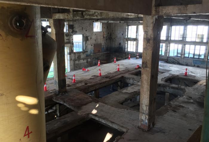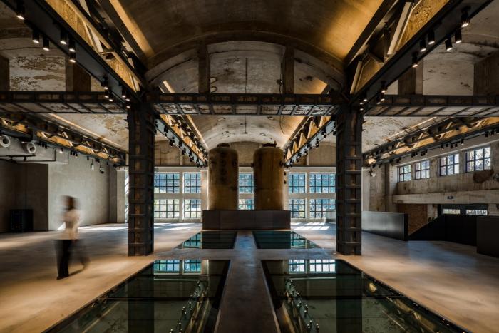 16号楼是故事最多的一栋楼,也是体量适中的一栋,是整个园区的中心所在。一个回游式美术馆是16号归宿的最美所在。原有厂房为放置大型设备在楼板上开了很多大洞,改造选择性的将原有洞的形态保留,用玻璃楼板代替。16号楼三联拱部分体现了当时工厂厂房的建造工艺,是结构美和空间美结合的经典,也是改造后美术馆的大型展厅所在。