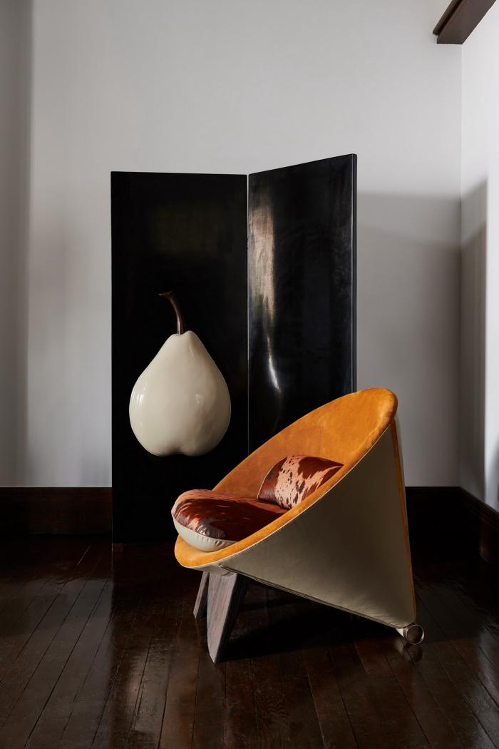 二楼的空间中设置了一个更为静谧的场所:一张1950年代的古董书桌,它由意大利著名建筑师和设计师Gianfranco Frattini设计,搭配来自巴黎的品牌R&Y Augousti的经典设计之一——Eden Chair(伊登椅),笔壳和青铜搭配了黑色的马毛,具有异域风情的造型,为空间带来一种神秘感。火炉上是主理人在摩洛哥旅行时的意外发现,这是三只由骆驼骨制成的器皿,都是当地匠人手拼接工制作而成,十分罕见稀有。与之相呼应的是壁炉内骨头造型的天然蜡烛,由Studio Morrison设计。