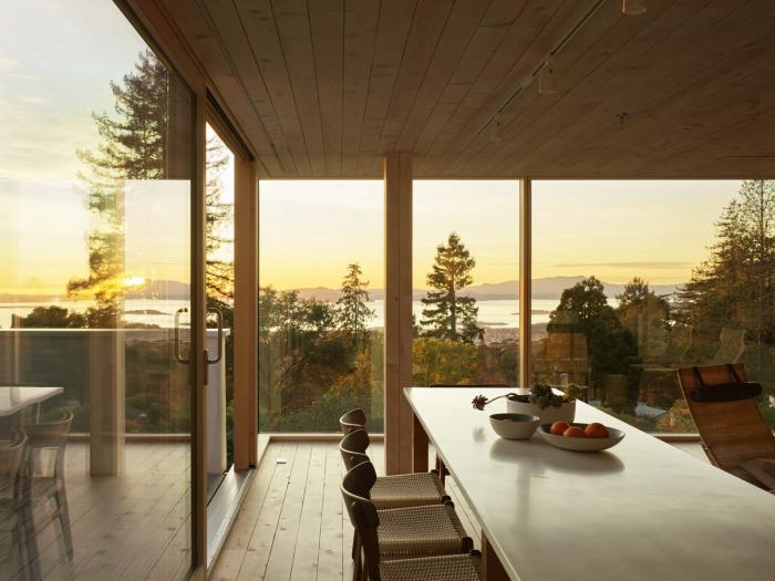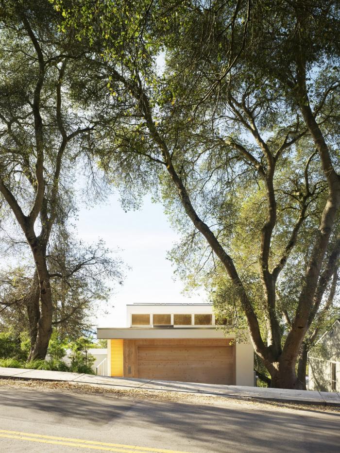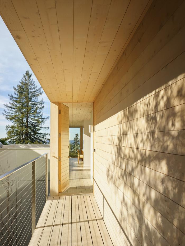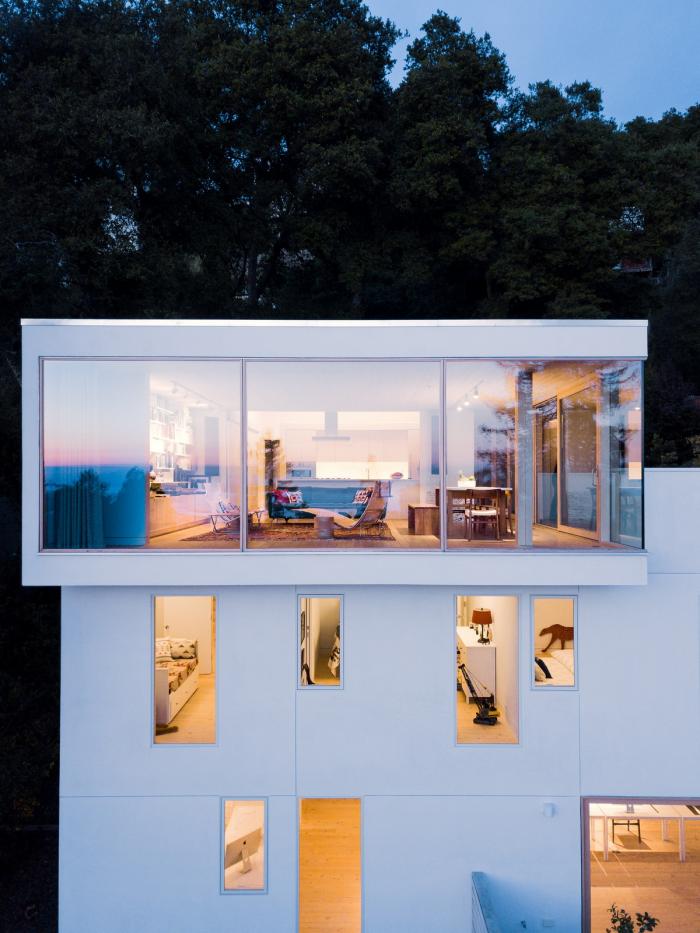 这座三层的房子位于伯克利山,在一个面对旧金山湾全景的陡峭斜坡上,其设计以地震限制、地形、微气候、阳光路径和场地内受保护的橡树为指导。为了应对地震和山体滑坡的风险,房子建在地基梁上,地基梁置于打入基岩的混凝土桩上,避免了挖方和建设挡土墙的麻烦和高额费用。该设计包括首次使用住宅抗震减震框架,它可以减缓结构在地震时的变形,并使结构能够以最小的破坏承受最大可能的地震。