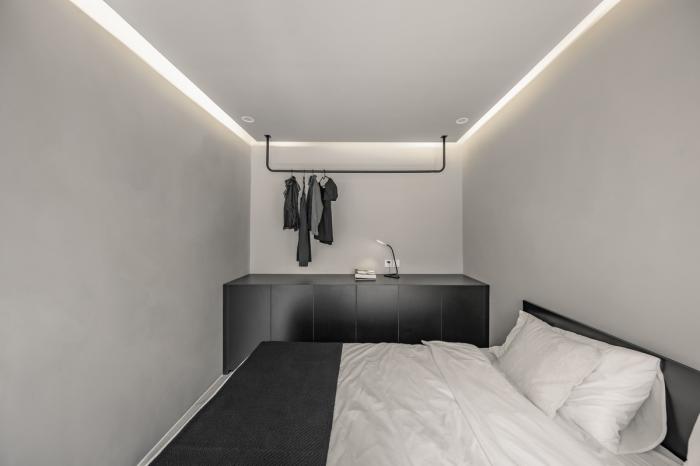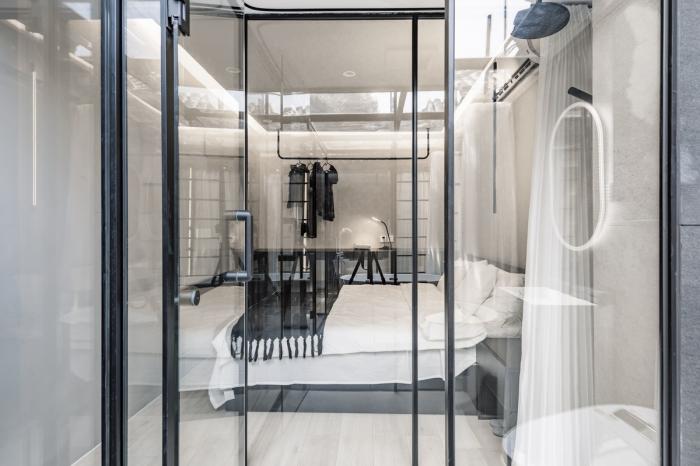 卧室区域则采用简约的设计语言,运用黑白两种色彩,让空间显得简约冷静,与外侧通透灵动的空间体验感形成对比,给卧室营造一种更加静谧的感觉。