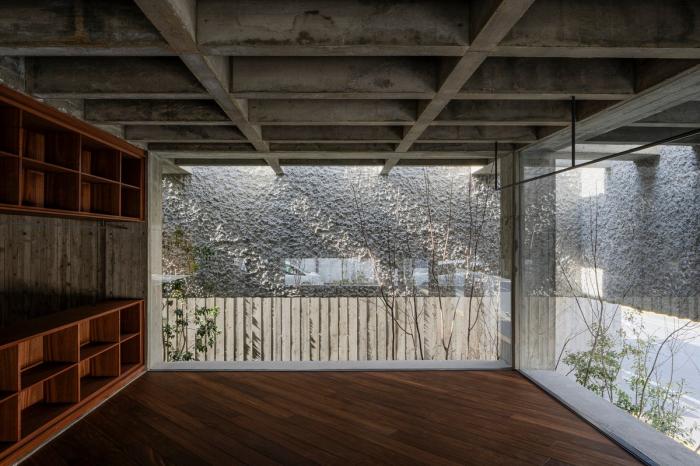 建筑师利用重复的混凝土晶格来引导顾客入店消费。而顾客一旦步入商店内部,其就会被强烈的水平线条和厚重的混凝土体块所震撼。