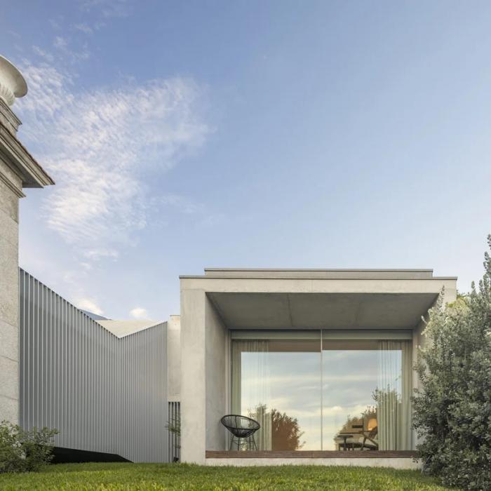 房屋的新增部分是一个裸露混凝土打造的悬挑体量,其通过玻璃板连接了室内空间与周围的花园,原建筑适应了具有特殊要求的当代建筑,二者通过玻璃廊桥连接。“其目的是在不破坏的情况下进行更新,在不借助模仿的情况下尊重原建筑,并促进丰富与同时代的干预相符的特征”,FCC建筑事务所补充到。