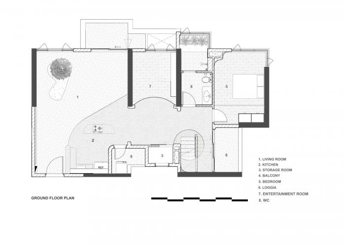 “MAI 公寓”在设计中致敬了建筑师路易斯·康在几何学上的美学,并选择了20世纪五六十年代盛行于西贡的水磨石的质感。如果现代主义建筑颠覆了功能性的结构原则与规整外观上多余的美学价值,那么,如何将这些标志性元素重现在这个乏味的四居室公寓中呢?也许,这个过程将永远处于试图模仿却无法触及的阶段。然而,正如路易斯·康在谈到他在寻找建筑的纯粹形式时所说:“我觉得这是一种对室内空间欲望的发现……住宅建筑是对内部需求极为敏感的建筑。在这种满足感中,存在着某种存在的意愿……但是对于这所房子来说,存在的意愿是不以几何形状来约束。” 由于无法调整公寓的主要结构,即当今公寓建筑中的强制重复原则,MÀI公寓在设计时尝试在内部范围内使用形状重新分配居住空间。公寓内排除了装饰细节,强调几何图案,例如大圆孔,弯角,用弧形拱门来分隔房间的,或将灯光线压到与墙壁相同的平面上。设计中的所有元素都是为了在整个公寓中创造出一系列几何形状。与此同时,还存在着一种张力,设计中这些有趣的元素拉在属于现代主义的点-线-面里。