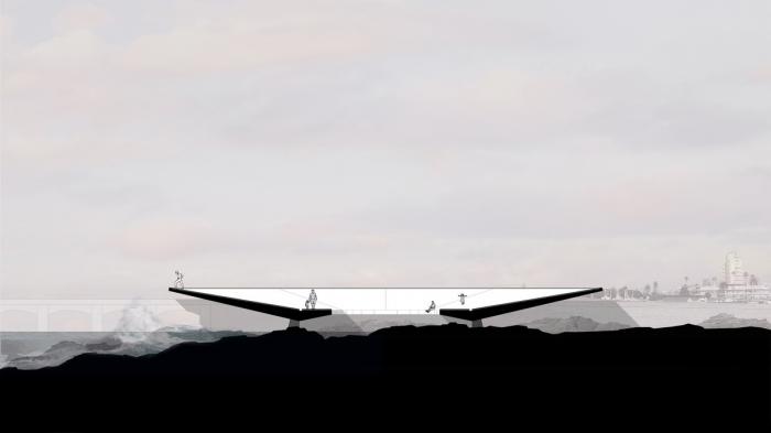 一条长长的人行道从海滨延伸向直径达40米的主环状平台。在“雕塑”的中心,有一个10米宽的洞口,岩石和下方的水在洞口穿过涌动。