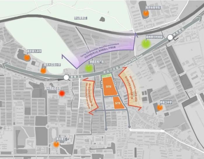 项目基地位于南京市玄武区钟山风景名胜区东南脚下,紧邻钟山风景名胜区(明孝陵景区、中山陵风景区等),周边学校、医院等配套服务设施齐全,距离孝陵卫地铁站仅400米,交通便利。