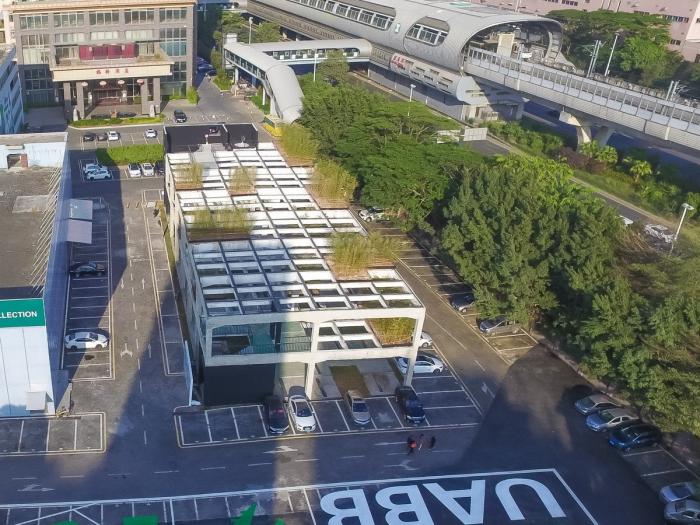 空中花园——为了让这个废墟框架体具有一种生命重生的感觉,建筑师决定在框架中增加一些植物。于是废墟就变成了空中花园。竹子和草坪被种植在切割剩余的楼板、屋顶和地面上。当然,不仅仅是这些刻意设计的自然之物在废墟花园中安家落户,风吹来的蒲公英,以及鸟儿带来的野生草籽,都伴随着时间年轮的循环慢慢进入到花园之中。