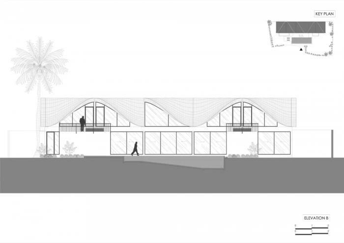 建筑是由简单、实用而重复的布局所定义的两层体量。一层被设计为一个简洁的盒子,包括了客厅、厨房、休息室和车库,上层则围绕布局着卧室、浴室和阳台。在外部,游泳池沿着建筑方向延伸,波状起伏的特征在水面形成了倒影。