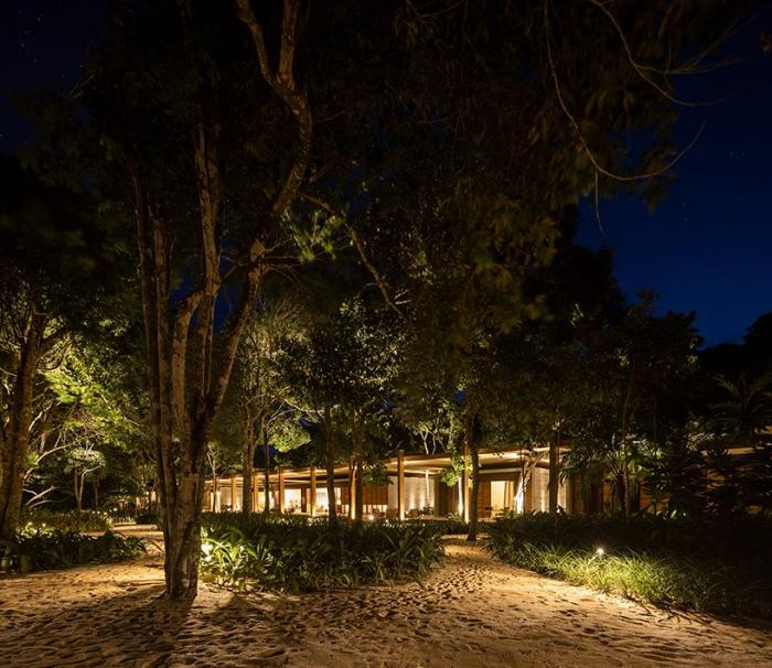 这座由MK27工作室设计的“沙屋”可以眺望大西洋的美景,其自身几乎消隐在了巴西东北部海岸的场地中。这座被巴伊亚州的热带森林所包围的海滩住宅(摄影:Fernando Guerra),位于支撑着五个封闭体量的木质甲板上。整个甲板上方覆盖着可渗透的桉树棚架,棚架被14个层压木框架支撑着。几棵树穿过甲板和头顶的遮篷,为居住者提供了持续的荫凉。
