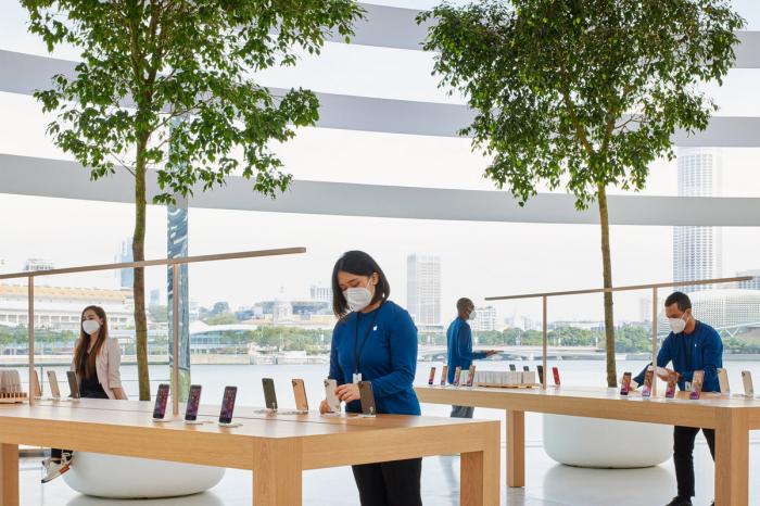 新落成的苹果新加坡滨海湾金沙旗舰店是新加坡海岸线的又一奇观。建筑师设计了一个直径30米且带有黑色玻璃底座的全玻璃圆顶结构。该项目是苹果设计团队与福斯特建筑事务所共同合作的成果。