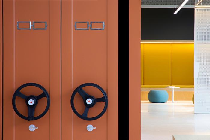设计师意图在一个小小的砖红色空间内将茶水间、储藏室和材质库等功能区布置得井井有条,以便为研发活动腾挪出更多空间。