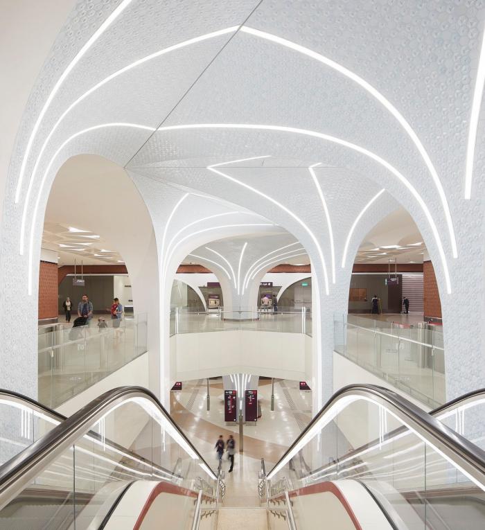 “在车站的设计中总能找到庆祝到达和离开的因素。建筑师在设计多哈地铁网络的时候,建立了一个自适应参数系统,以此打造开放、明亮和温馨的室内空间。建筑重新诠释了传统卡塔尔建筑的特色,并在其中融入了创新的、具有变革性的特质,以此捕捉光线,并将其引入室内,创造令人愉悦的光亮空间。