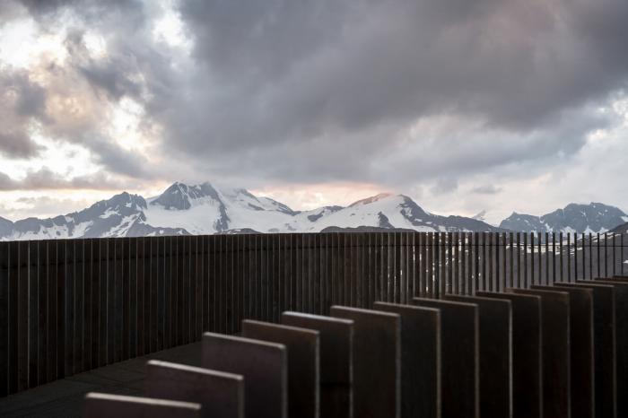 说到时间,一个漏斗状的体块嵌入了波浪状的观景台,将观者的视线引向永恒的景色——那就是冰人奥茨的发现地。就在离奥地利边境仅有几米的地方,“视线漏斗”将人们的视线引向一段精心制作、讲解知识的通向冰人的旅程。视线漏斗由耐候钢制成,就像栏杆上的板条一样,铁呈现出暗棕、灰色和黑色,顺应场地的元素并与环境融为一体。漏斗的尽端是一个玻璃栏杆,给你一种类似飞行的激动人心的悬念——好像正在空中行走一样。