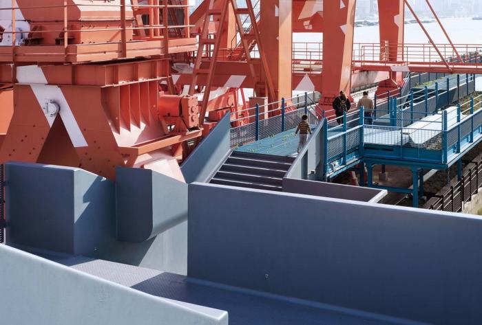 电厂段的工业遗构整饬始于两个锚点。一方面,公共空间的营造在理解原先工艺流程的基础上展开:高105米的烟囱,江岸上的鹤嘴吊、输煤栈桥、传送带、清水池、湿灰储灰罐、干灰储灰罐等作业设施有着特殊的空间体量和形式,这些场地遗存为我们提供了塑造场所精神的出发点。