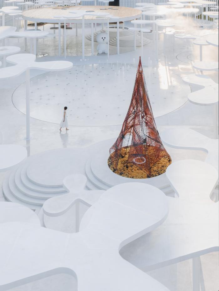 森林的空地中隐藏着117个喷嘴。可以霎那间喷涌出喜悦的甘泉。我们可以在喷泉中嬉戏并与其舞蹈,一切矜持都可以抛去九霄云外。越过喷泉,是机器人把5954米荧光碳纤维变成一个红色的圆锥体,它被轻轻放在白色山丘上,它是一个可以进入的固体火焰,它就是这白色森林里的让人安全和温暖的篝火。