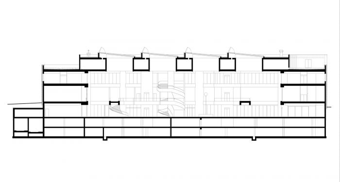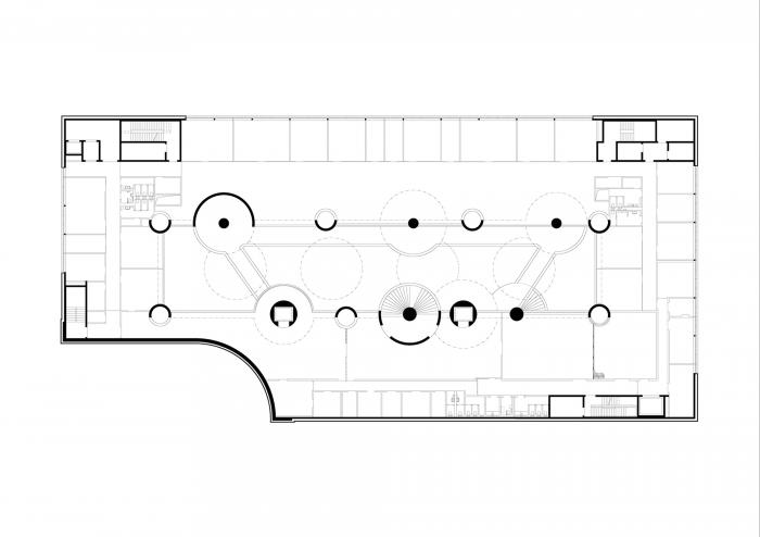 巨大的中庭长64米、高15米、宽13米,它既是一种夸张的空白,也是建筑秩序中基础的存在。一系列承重的圆柱和墙体打造了其内部结实的结构,因此所有的活动也围绕着这些区域布置。柱体显示了建筑充满韵动的一面。楼梯、电梯、走道和联通桥则创造出其空间及体验上的连通和交流,这一空间也是瑞士莲巧克力之家的核心区域,它与其近乎平静淡然的外表形成了鲜明对比。