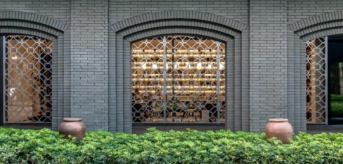 铝合金窗花对竖挺、窗格外挂构件、水平龙骨等细节处做了精细化设计,将玻璃与外挂窗格单元结合。混凝土窗花从传统套方样式棂花元素简化、抽象出“西”字图案,别具匠心。窗格与青砖相映衬,交织出历史的厚重感。