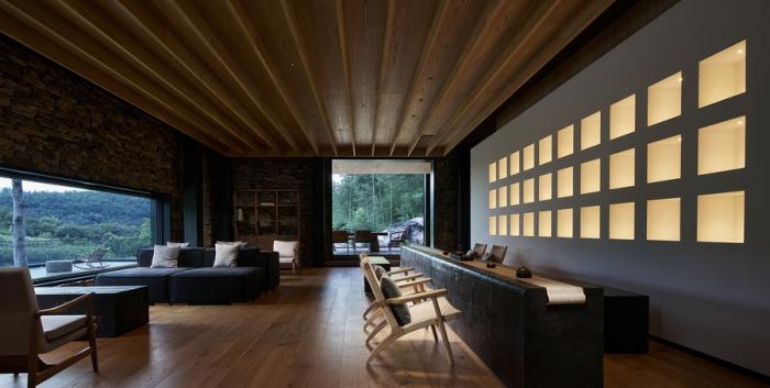 二层由四间客房组成,三间大客房加一间亲子房,户型的多样性,让客人的体验更丰富。空间对原有木材进行再次利用,结合石墙与钢材,刚柔并济。整体内外塑造更讲究建筑与环境的融合,空间与自然的关系,可视的窗景意为画境。