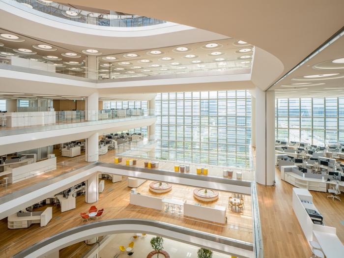 建筑师围绕中庭设计了螺旋的空间结构,以形成不同的层高。同时,这种错层的设计还可以促进员工间的视线交流和合作沟通,并使得自然光照可以更好地进入室内。
