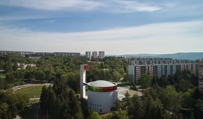 该教堂有一个圆形的平面布局。圆形是天堂和永恒的古老象征,与象征大地和短暂的正方形相反。天堂在屋顶下方围绕教堂的彩色环形窗中得以反射。可以说是圆形漂浮在 Lesná 的上空,或者,在一个形象的、超然的层面上,天堂漂浮在 Lesná 的上空。我们选择圆形作为教堂的形状有几个原因。圆形是饱满的形状,它是住宅区的句点,也是应该成为人们从日常的喧嚣中挣脱出来,休息片刻,或者是自我回想的精神焦点。