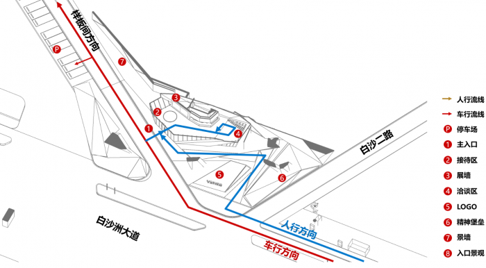 我们需要解决的另一个问题是如何消解仅有200多平米功能空间的极小体量和甲方需要的标志性之间的矛盾。我们提出的解决方案是将建筑和景观雕塑一体化设计。通过景观雕塑式的构筑物(廊)将零碎的边界撑满并限定出场所,并通过构筑物的围合提示来引导流线的组织。
