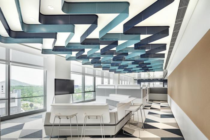 工位组团间,以开敞协作桌作为间隔,用地铺和天花造型作为软式隔断对其进行划分,强调空间属性。