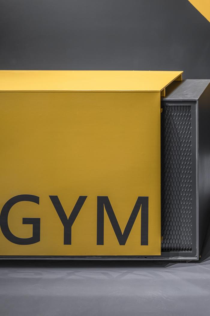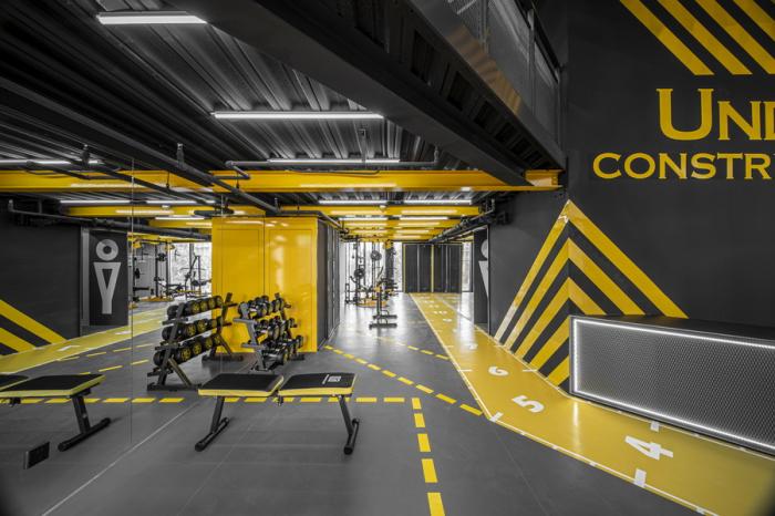 UNDER CONSTRUCTION健身房需要延续其“未完工的施工现场”这一设计风格,不同于以往裸露混凝土、工字钢等结构部件的设计手法,大观建筑在此次健身房的设计中以夸张的“黄色警戒线”来体现施工现场的视觉效果。