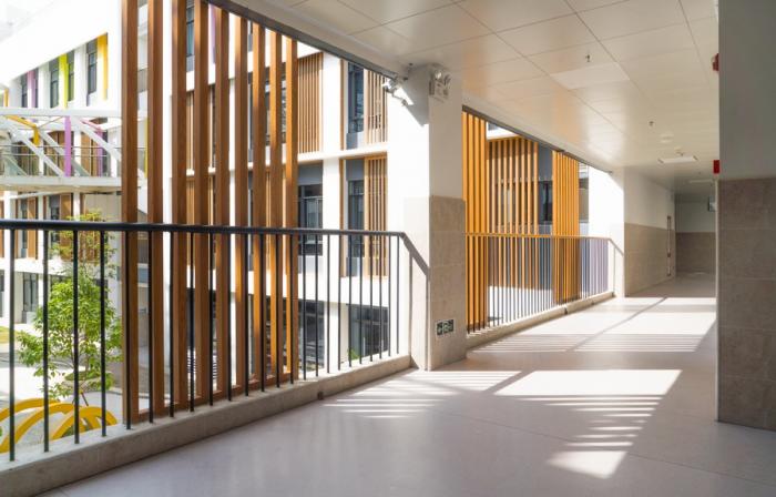 东侧单元的外走廊,镶嵌了彩色的盒子型空间,孩子们可以在这里停留、交流。盒子外侧的推拉百叶窗,在遮阳的同时,也给建筑的立面和外走廊,带来生动的光影。