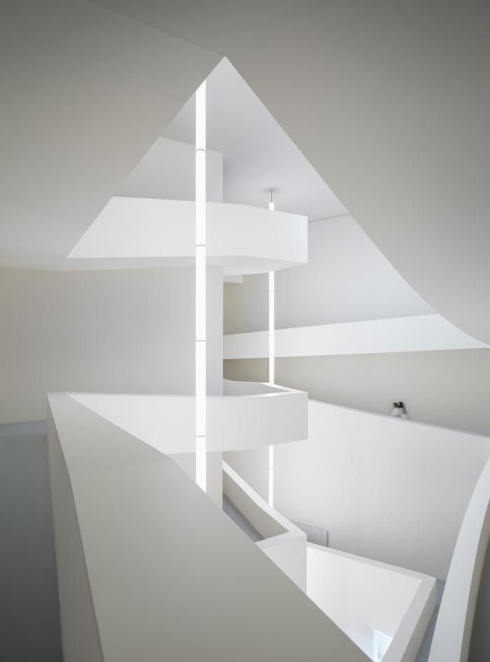 最后,宽敞的三角形通高空间贯穿于建筑的东南角,顶部的天窗引入天光;而整个空间便由一条贯穿一楼至四楼的坡道所环绕。白色的墙体上强化了自然光的明暗变化,光线又通过特别设计的窗洞和门洞进入到周围的房间内。