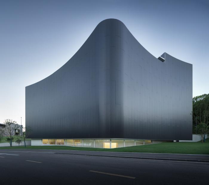 4.整座建筑被波纹铝板覆盖——在环境中整体呈现为较暗的色调。随着光线射入角度及视角的变化,颜色也会由黑色变至银色,变化不断。建筑的内部可以说是一篇关于光线艺术的“美文”,光线被捕获进内部天井,并从此处散布到周围的空间,逐渐变得柔和旖旎。