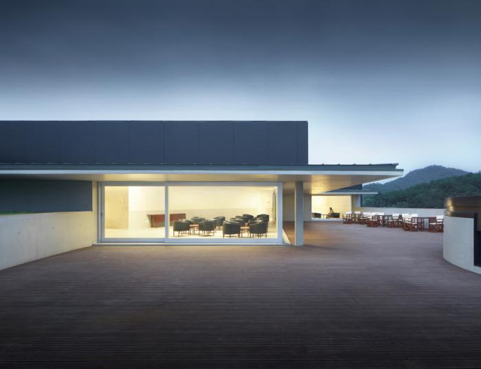 从入口区域和地下室均可到达的靠山一侧的挡土墙结构体成为了山体和植被的边界。从内凹的VIP入口可进入到内部独立门厅,并由此可直接通向屋顶露台。
